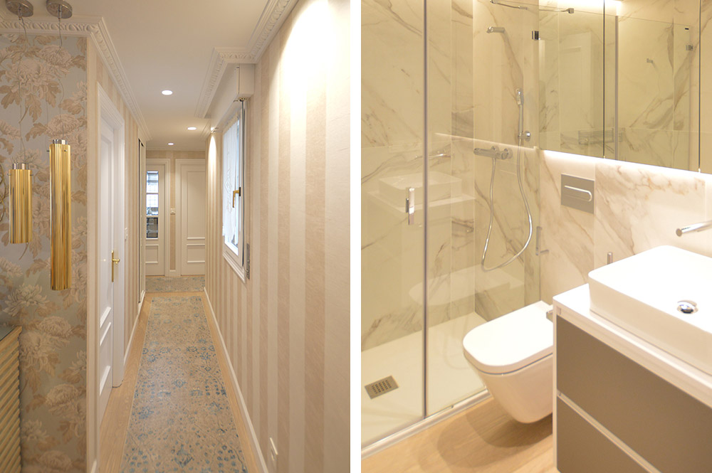 El proyecto aprovechó la distribución original y junto con el uso de colores neutros se logró dar una sensación de amplitud a toda la vivienda. La clienta, entusiasta de los papeles tapiz, participó de manera activa en todo el proceso de rediseño y se encargó de elegir cada uno de ellos para dar luminosidad y libertad al espacio.